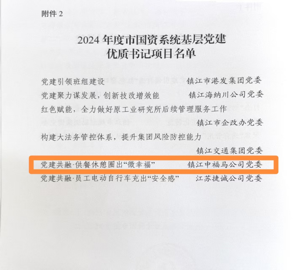 近日,從鎮江市人民政府國有資產監督管理委員會傳來喜訊,鎮江中福馬機械有限公司書記項目“黨建共融·供餐休憩圈出‘微幸?!北辉u定為“2024年度鎮江市國資系統基層黨建優質書記項目”。